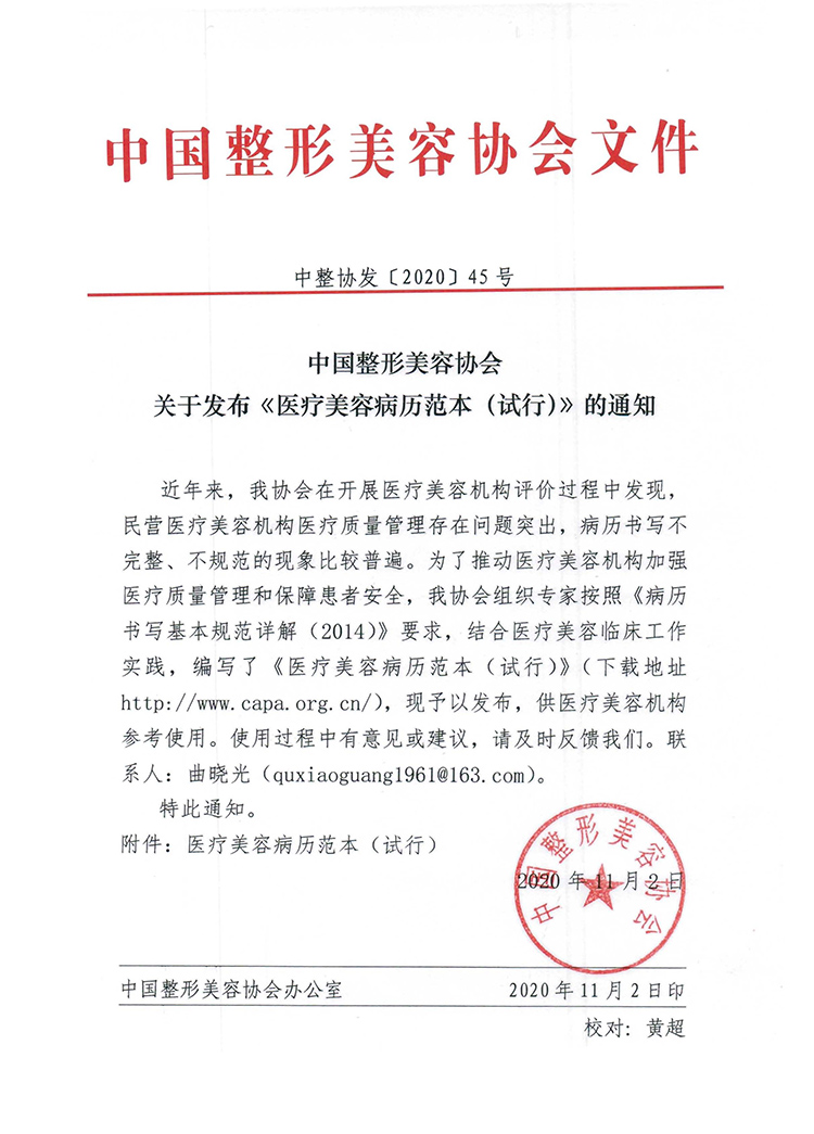 11月2日,中国整形美容协会发布通知,公布了《医疗美容病历范本(试行)》。通知指出,中国整形美容协会在开展医疗美容机构评价过程中发现,民营医疗美容机构医疗质量管理存在问题突出,病历书写不完整、不规范的现象比较普遍。为了推动医疗美容机构加强医疗质量管理和保障患者安全,中国整形美容协会组织专家按照《病历书写基本规范详解(2014)》要求,结合医疗美容临床工作实践,编写了《医疗美容病历范本(试行)》。